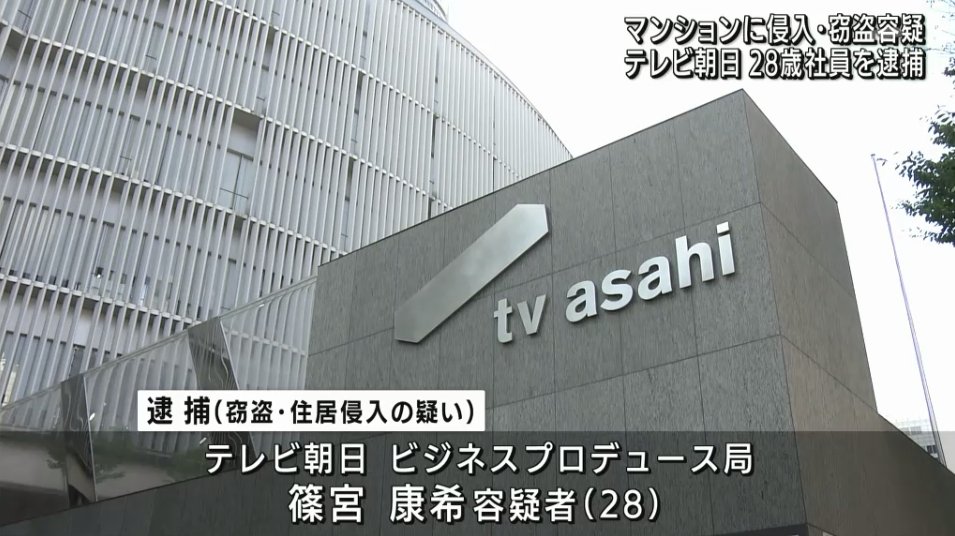 テレビ朝日は19日、ワイヤレスイヤホンを盗んだとして、窃盗などの疑いで同社社員が警視庁に逮捕されたと発表した。