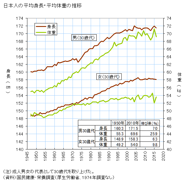 日本人の身長は30代がピークでだんだん身長が低下してきた